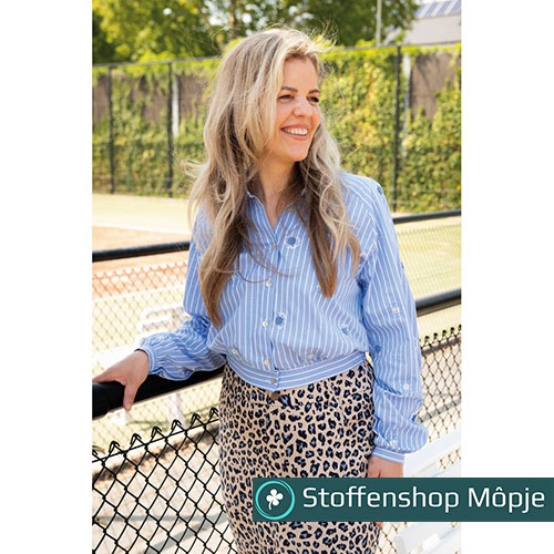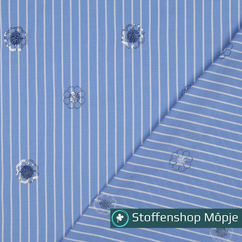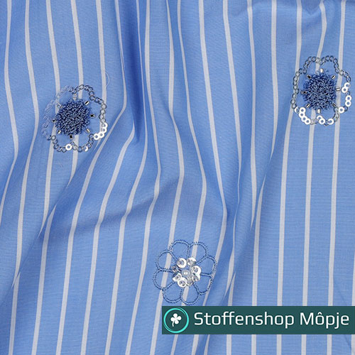 Mooie katoen met pailletten bloemen op een blauw-wit streepje. Zeer geschikt voor de patronen uit nummer 26 van het patroonblad Poppy meets Pommé.